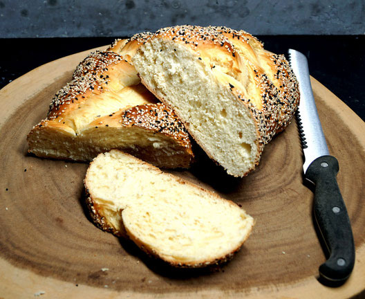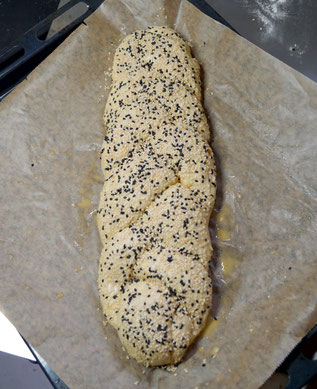 - Sesamsorten vermischen und dann auf den Zopf streuen, dabei ruhig vorsichtig ein wenig andrücken