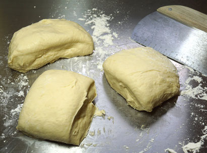 - aufgegangenen Teig in drei gleiche Stücke teilen und diese zu ca. 40cm langen Strängen rollen, die an den Enden jeweils etwas dünner auslaufen dürfen