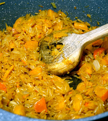 Also, auf, auf zum lustigen Kürbisorzottoexperiment. Ich koche gleich mal für zwei bis drei Hungrige... no risk, no fun!
