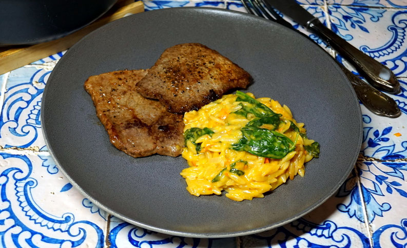 Also: Auf den Teller kommt diesmal eine risotto-ähnliche Speise, die eben auf den Reis verzichtet und dafür Kritharakinudeln nutzt. Ziel ist es ganz klar, dem Gatten den bereits vor Tagen