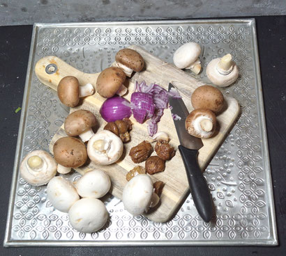 - Pilze gut putzen, Stielenden kappen und je nach Größe in eingermaßen gleichmäßige Stücke schneiden