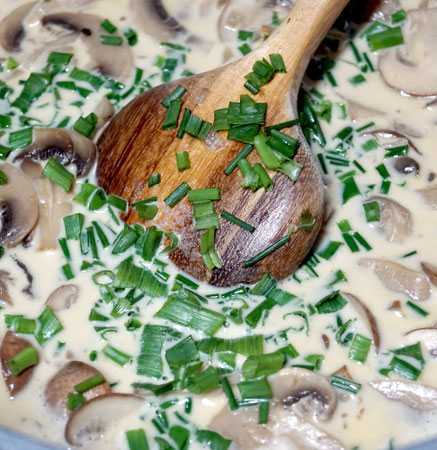 - gehackte Kräuter zur Pilzsauce geben, eventuell noch einmal abschmecken