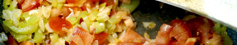 • Zwiebel- und Paprikawürfel darin anschwitzen, ohne sie Farbe annehmen zu lassen